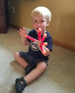 Sunday, we were supposed to go shopping for a birthday present for one of his friends. Before we even started getting ready to go, I asked him if he was going to be able to deal with the trip fit free since there was no way we were getting anything fun for him. Of course he can! Why would I ask such a silly question?! Buuuuuuuut, since we're going to already be there, isn't there any chance he could get something small. No. And that dented plastic baseball bat is a great example of why. He quickly realized this was not a battle he was going to win, and let it go.