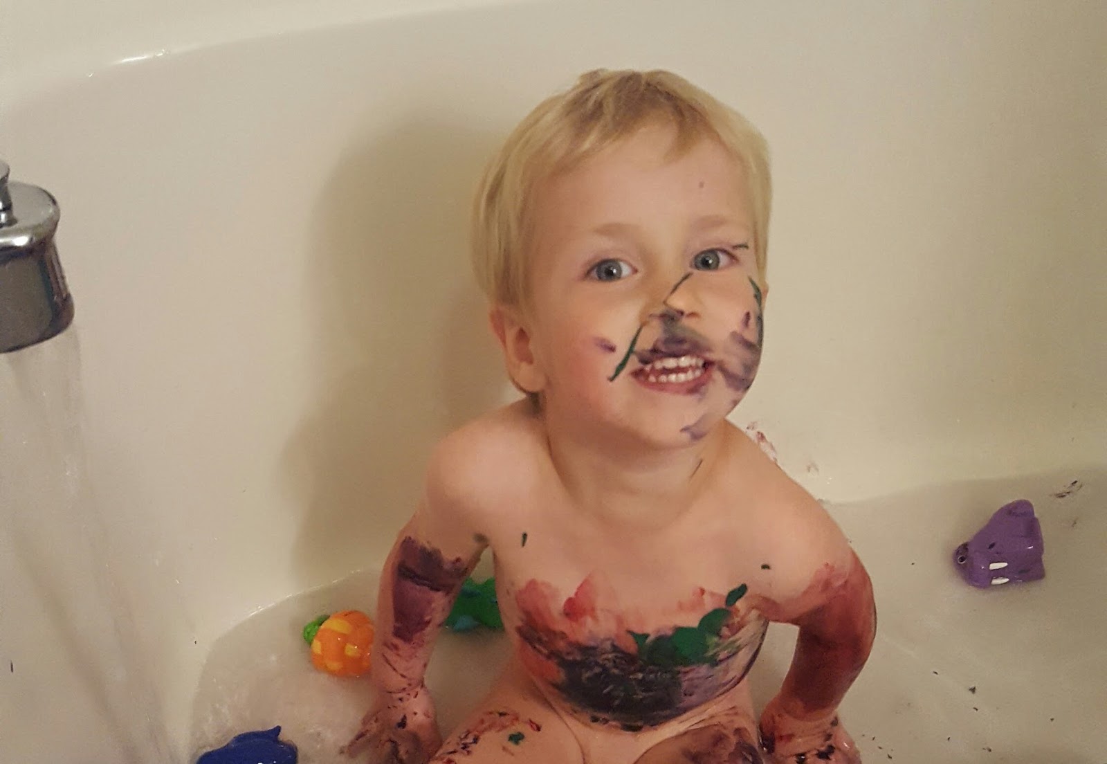 Sam wanted to paint yesterday. So I busted out the finger paints and a big ol' piece of paper, stripped him down to his diaper, and let him go at it. Immediately, Alex wanted to paint as well. Good good. With the paint all being washable, I didn't think too much of it when I left the room for 2 minutes to talk to Travis.